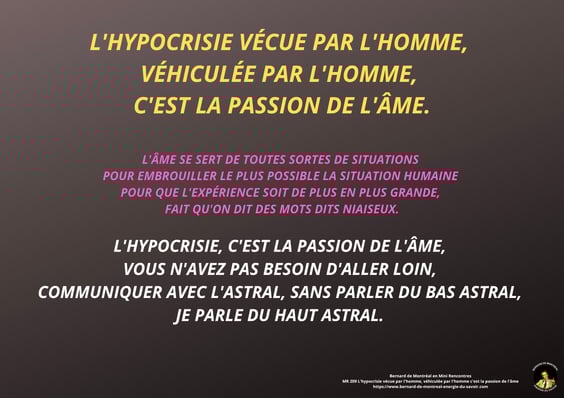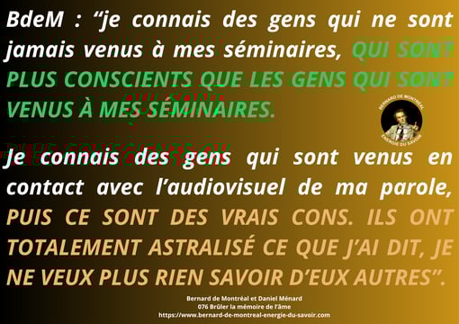 Ceci permet de dépasser les déviations, dévoiements et interprétations ésotérico-spirituelles, intellectuelles, logico-rationelles ou psychologiques, de ceux qui promènent leur public avec leur prétendu savoir, souvent réduit à du plagiat, à du remake, ou une absence totale d’intégration et/ou de cellularisation de l’énergie de l’instruction... Nous passons sous silence les egos qui utilisent BdeM comme vitrine et vendant très cher des prestations diverses et variés, sans qualifications professionnelles reconnues. Ces dernières étant là pour protéger sans conteste leurs "clients" des dérives astrales.