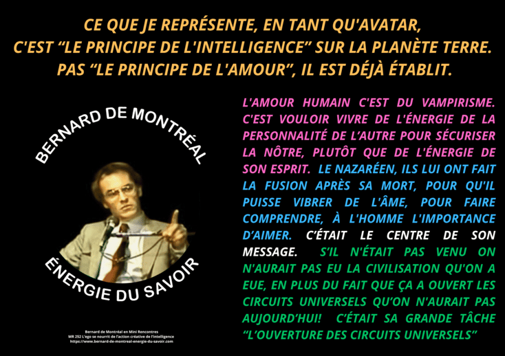 Sa parole vibratoire diffuse "l'énergie de l'Intelligence pure". Il n'est pas un dieu, ni un messie, ni un gourou spirituel... Il est mort en homme et n'a jamais été aussi vibrant que mort ! L'énergie de "sa source" est atemporelle et immortelle, elle ne peut être confondue, ni amalgamée au personnage qui a descendu cette énergie de l'Intelligence Universelle sur Terre.